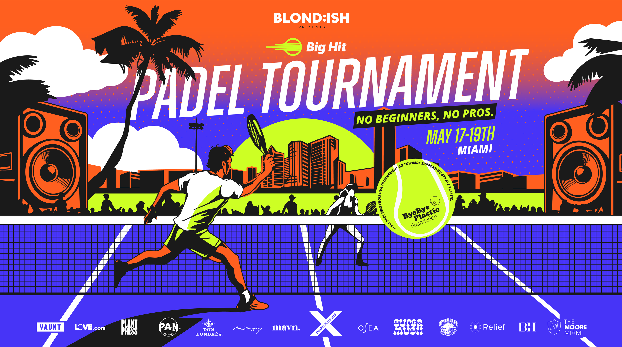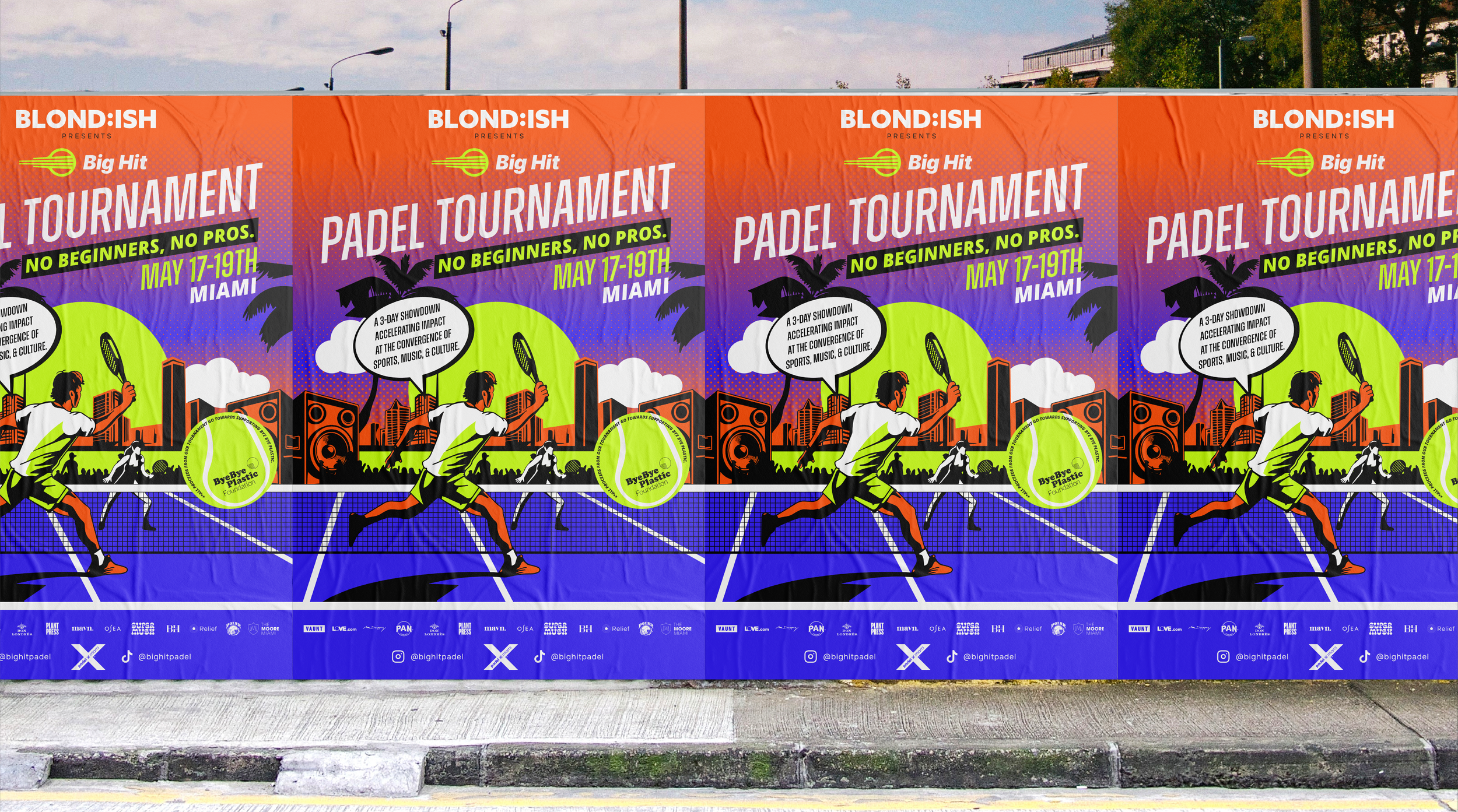 Big Hit Padel partnered with us to create a punchy and vibrant poster and social media campaign for their Padel event in partnership with musical artist Blond:ish, her company ByeByePlastic, and Padel X Miami, to raise money and awareness for sustainability. Working with the BHP creative team, we developed a line of variations on the poster, a series of motion graphics for the event, and a range of merchandise designs. The overall aesthetic is loosely vintage, beachy, and bright.