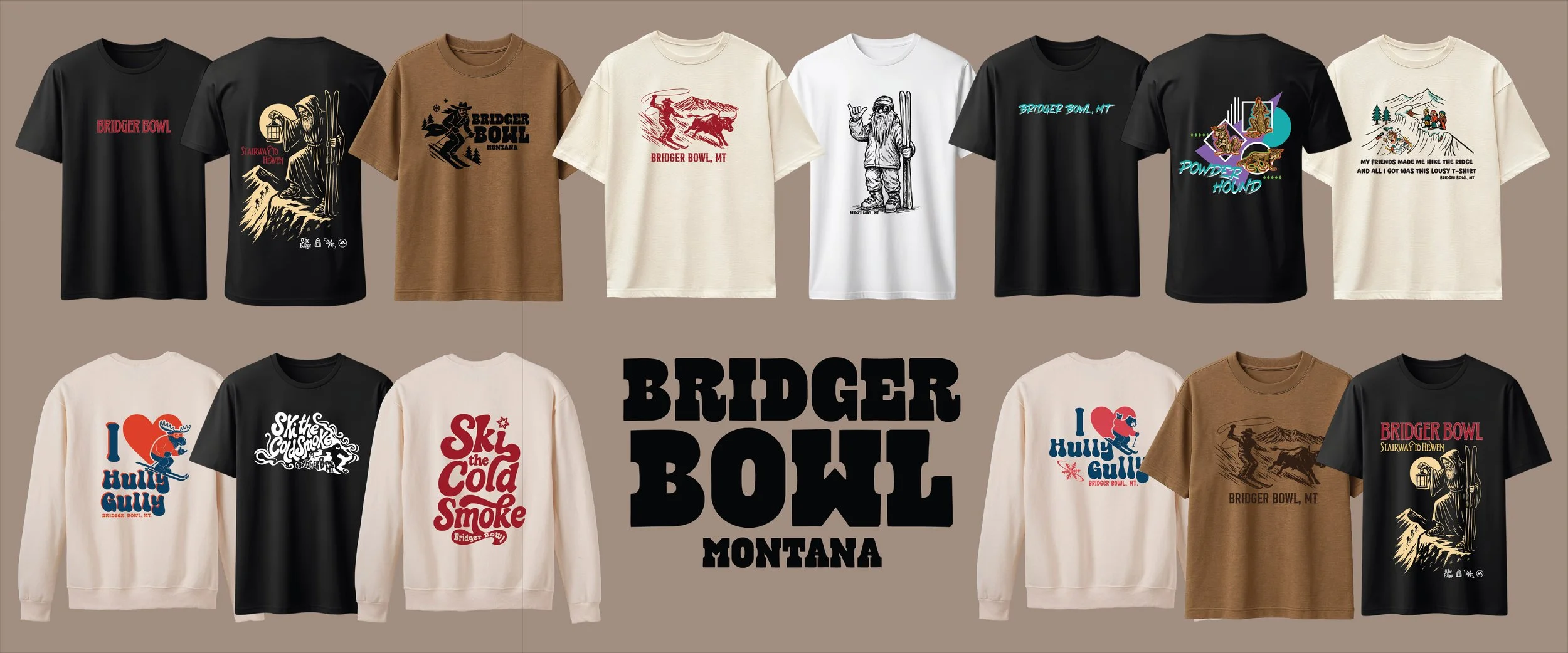Bridger Bowl is a community-driven ski area in Bozeman, Montana, known for its local culture, and great skiing. We partnered with their team to develop a seasonal apparel collection that reflects the spirit of the mountain, pulling from retro ski graphics, Western iconography, and the kind of inside jokes you only get from time spent on the mountain.